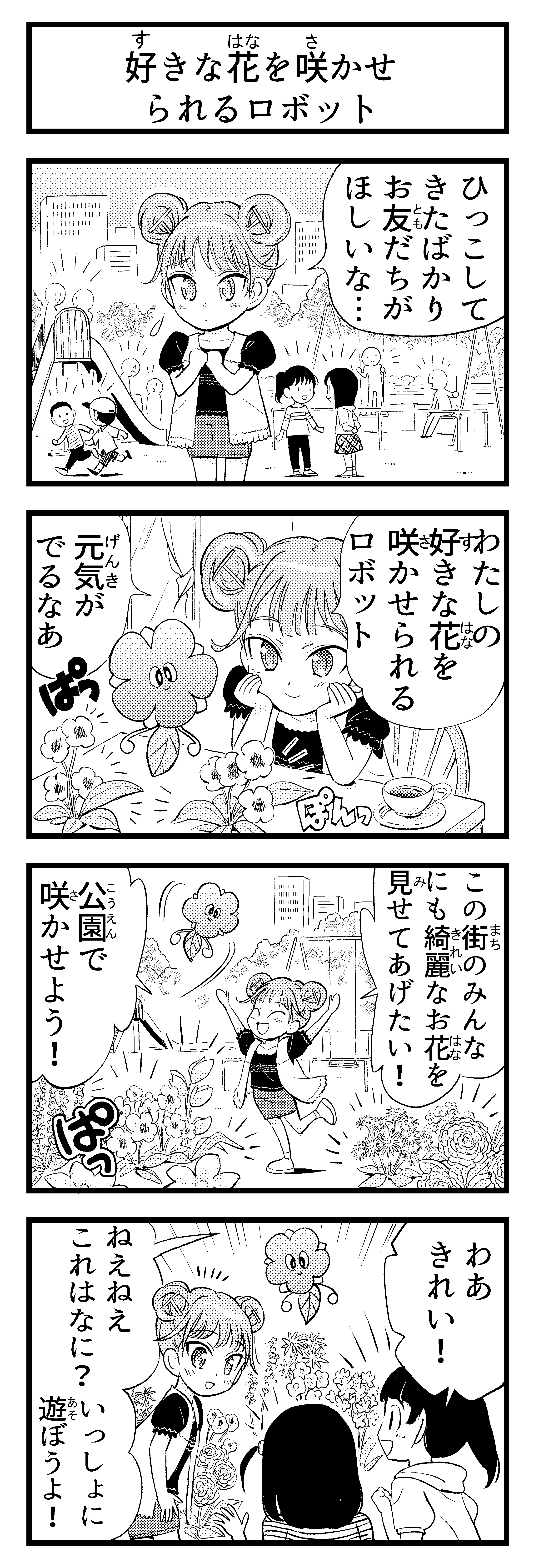 「これは、何ていうお花?」「これはね、!」女の子が大好きなお花だもの、もちろん話もはずみます。お花には、友達をたくさんつくれて、みんなを笑顔にする魔法があるんだね。キラッキラの笑顔になった女の子を、ロボットは遠くから見守っていました。