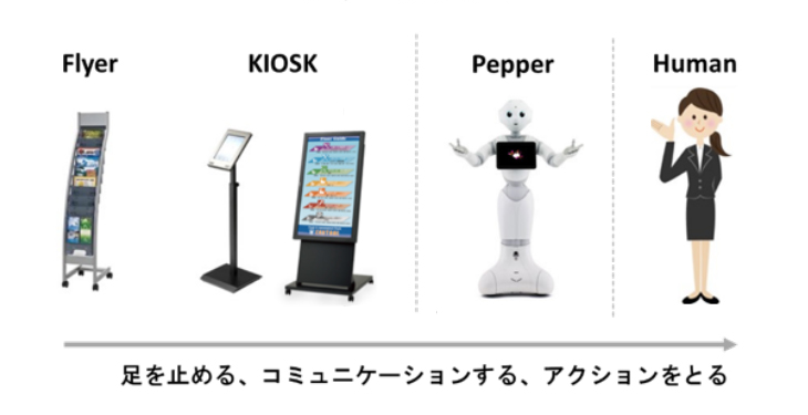 エンゲージメントとは「人を引きつけアクションに導く力」です。人型であるPepperは、デジタルサイネージやタブレットよりもはるかに強いエンゲージメント力を持っており、この力が様々なお店での活躍に活かされています。