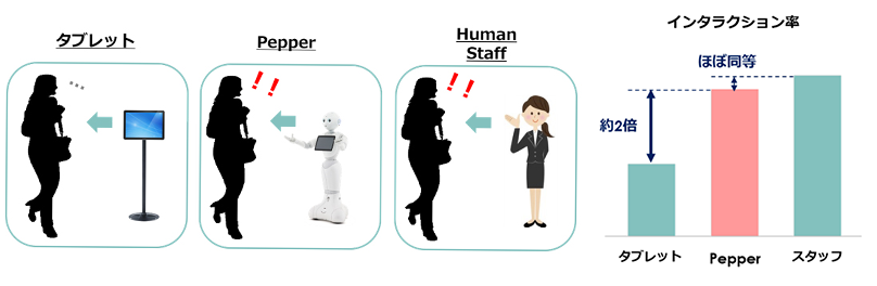 通行人約300人を対象に、キャンペーン内容に興味を持ってインタラクションされた方の割合を比較したところ、Pepperのエンゲージメントはタブレットの2倍、スタッフとほぼ変わらないという結果となりました。