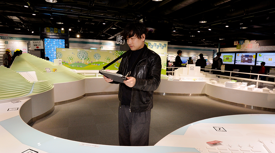 筆者が行っているのは「マチスキャナー」。ジオラマ化した街をタブレットで読み取ることで、発電所やさまざまな乗り物の仕組みについて知ることができる。ハイテク!