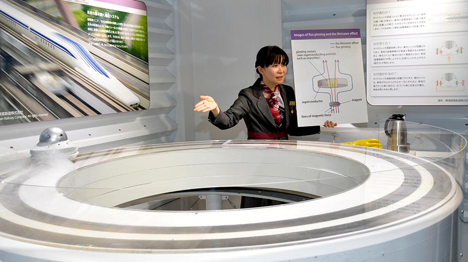 こちらは、リニアモーターカーや医療用MRIなどに使われる「超電導技術」の実演コーナー。マイナス196℃の液体窒素を使って「超電導」を生み出す仕組みを、分かりやすく解説してくれる。