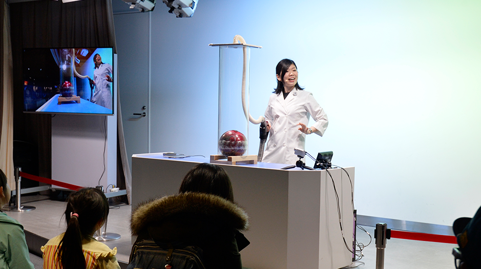 1日3回の「サイエンスステージ」も必見だ。この日のプログラムは「空気のサイエンスショー」。約6kgのボウリング球を空気の力で持ち上げるという手品のようなショーに、子どもたちの視線は釘付けになっていた。(※期間、曜日、時間帯によってプログラムが異なるため、当日のスケジュールはHPにてご確認ください)