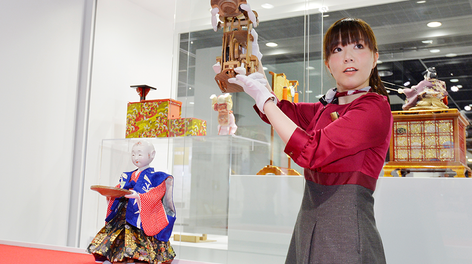 こちらはロボットの祖ともいえる江戸時代のからくり人形「茶運び人形」や「弓曳童子(ゆみひきどうじ)」の実演コーナー。特に弓曳童子の方は、矢をとる→弓につがえる→的を射るという複雑な動作をゼンマイと歯車などの組み合わせのみで再現した優れモノだ。
