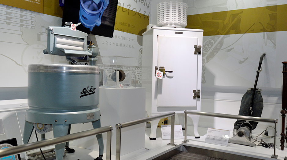 たとえば、写真左は1930年に製作された国産初の電気洗濯機「ソーラー」。洗濯容量は約2.7kgと、現在の洗濯機と比べると少ないようだ。ちなみに価格は370円。ずいぶんお安いのね、と思いきや、当時の銀行員の初任給が70円とのことで、現在の価値では100万超えというところか。一般家庭での購入は難しかったそう。